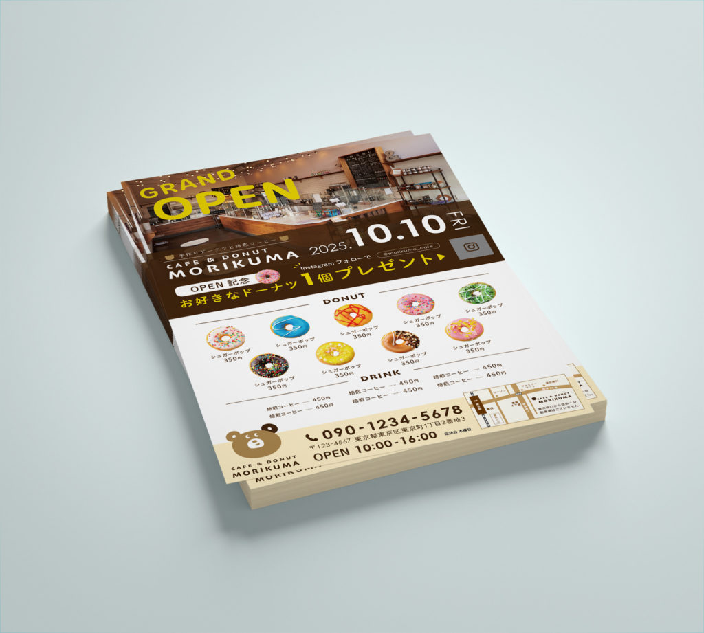 ドーナツカフェのブランディング CLIENT CAFE&DONUT MORIKUMA様 PROJECT logo / shopcard / 三つ折りパンフレット / A4両面チラシetc 依頼背景 新規オープンのCAFE&DONUT MORIKUMA様のロゴ作成&ブランディングデザインをご依頼いただきました。ご家族連れや年齢性別問わず楽しく美味しくワクワクするような可愛くて愛されるデザインをご希望とのことでした。 CONCEPT まずマスコットキャラクターのモリクマさんについてペルソナを設定しました。モリクマさんはドーナツが好きすぎて片耳がドーナツになったのですが、目線や口元が愛嬌を兼ね備えていて愛されるマスコットになっています。可愛いキャラクタに合わせて統一感のあるブランディングを考えていきました。 shopcard カラフルな自慢のドーナツを並べて思わず部屋に飾っておきたくなるようなショップカードを目指しました。 stampcard スタンプを押す部分はドーナツ型のスタンプを押すことを想定したデザインにしました。もしかしたら日替わりで押してくれるスタンプの色が変わるかも。そんなワクワクを想像しています。 A4片面チラシ オープン記念クーポン付きのチラシを制作しました。店内の雰囲気に合わせたデザインに仕上げました。 三つ折りパンフレット 店内設置用でメニュー表とも兼用できるように商品の魅力をしっかりと伝えられるレイアウトにしています。 お持ち帰り用バッグ お土産用のお持ち帰りバッグです。シンプルだけどこっそり可愛いショップバッグです。 この度は、とても可愛い新規オープンカフェのロゴやショップカード、パンフレット制作などのブランディングのご依頼をいただきましてありがとうございました!